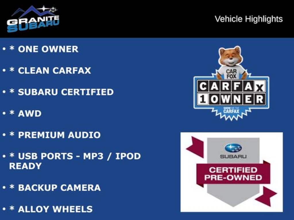 * ONE OWNER, * CLEAN CARFAX, * SUBARU CERTIFIED, * AWD, * PREMIUM AUDIO, * USB PORTS - MP3 / IPOD READY, * BACKUP CAMERA, * ALLOY WHEELS. Odometer is 6945 miles below market average!