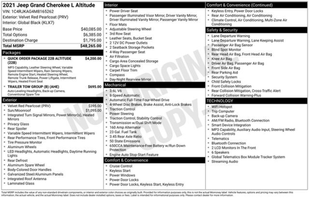 This 2021 Jeep Grand Cherokee L Altitude is the perfect blend of capability, comfort, and technology. Experience the difference for yourself â" schedule a test drive today and discover why this SUV should be at the top of your list.