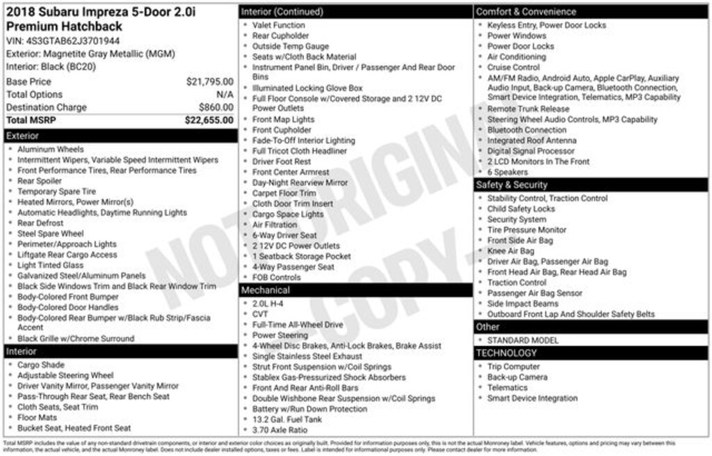 - Radio: Subaru Starlink 6.5" Multimedia System